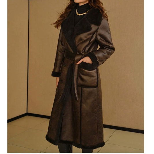 Abrigo de Cuero con Solapa y Puños en Pelos
