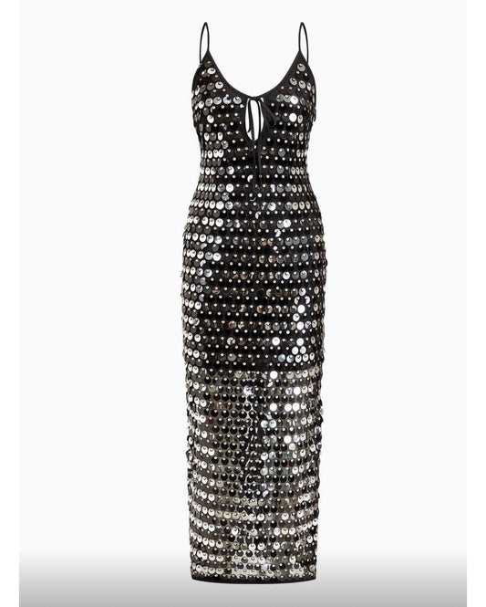 Vestido con Escote en V y Flecos en Lentejuelas Vm