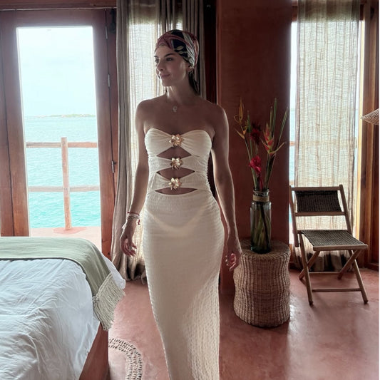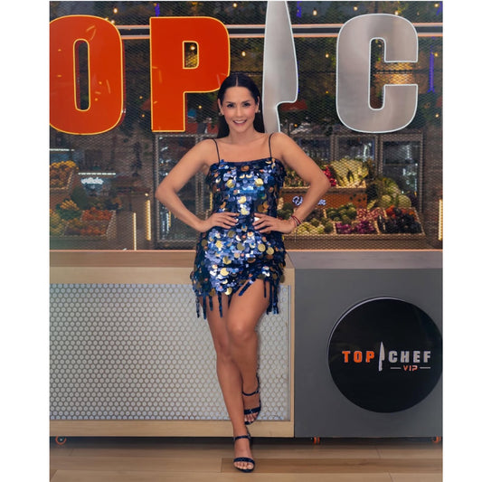 Vestido Mini Strapless en Pedrería de Flecos vm