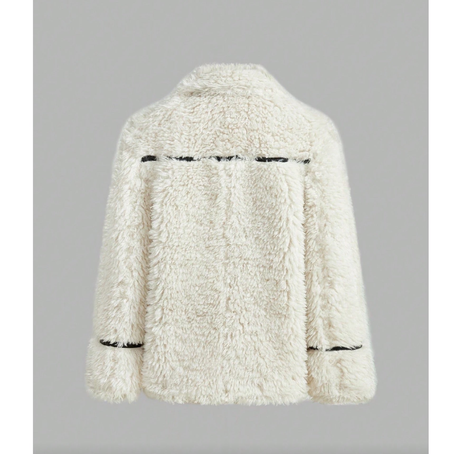 It is made of a white sheepskin material, which offers a soft and warm texture. The contrasting black line details give it a structured and elegant touch, highlighting its design.