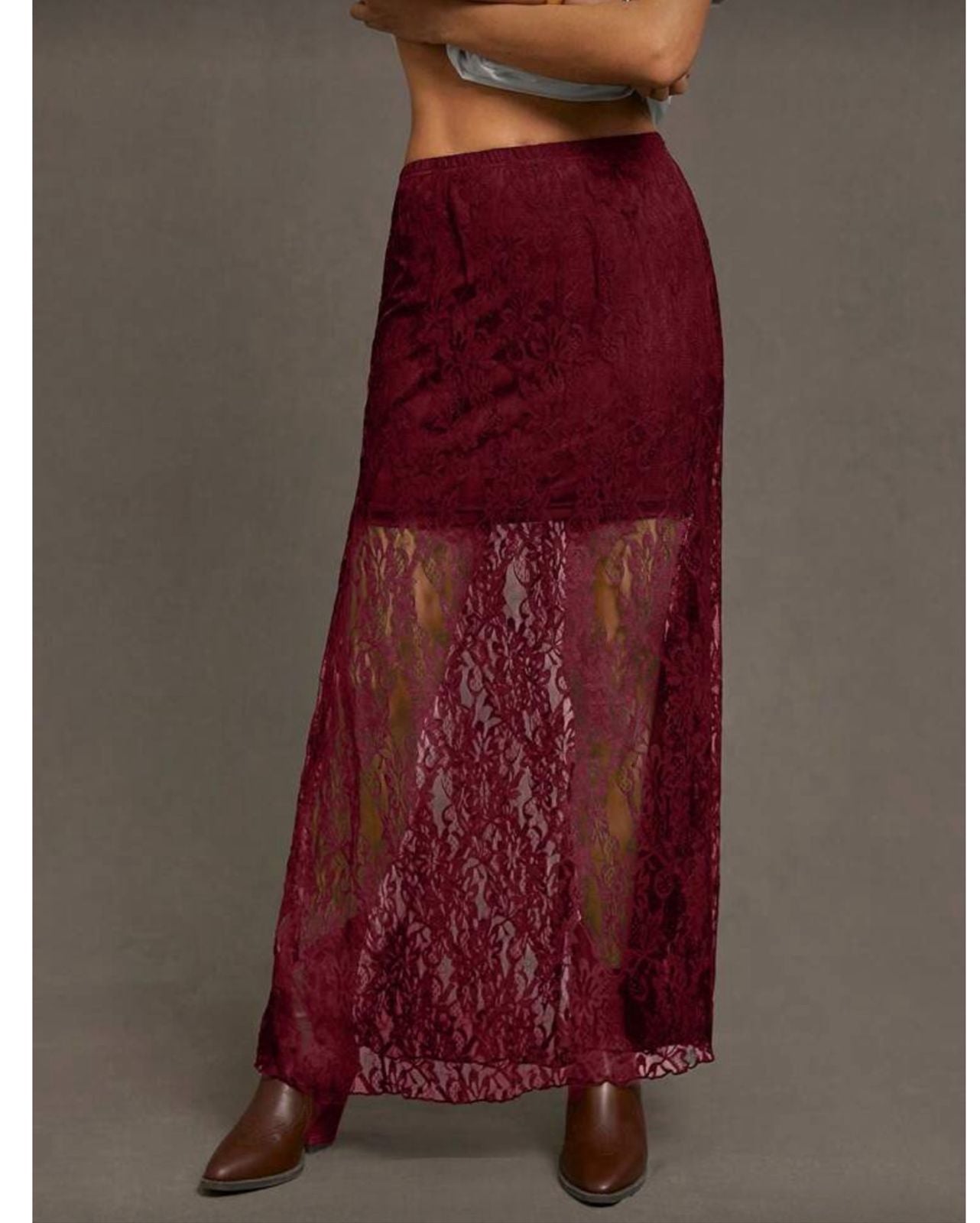 Maxi falda de encaje con transparencia. Confeccionada en un delicado encaje floral color vino tinto, esta prend... View More