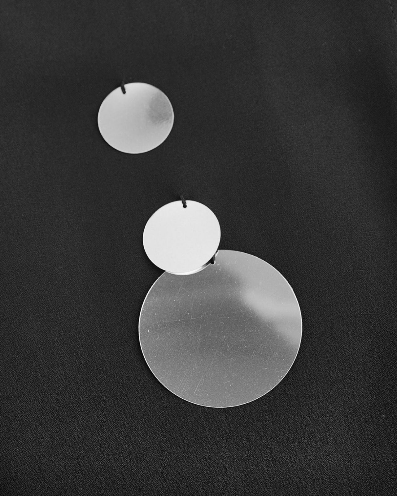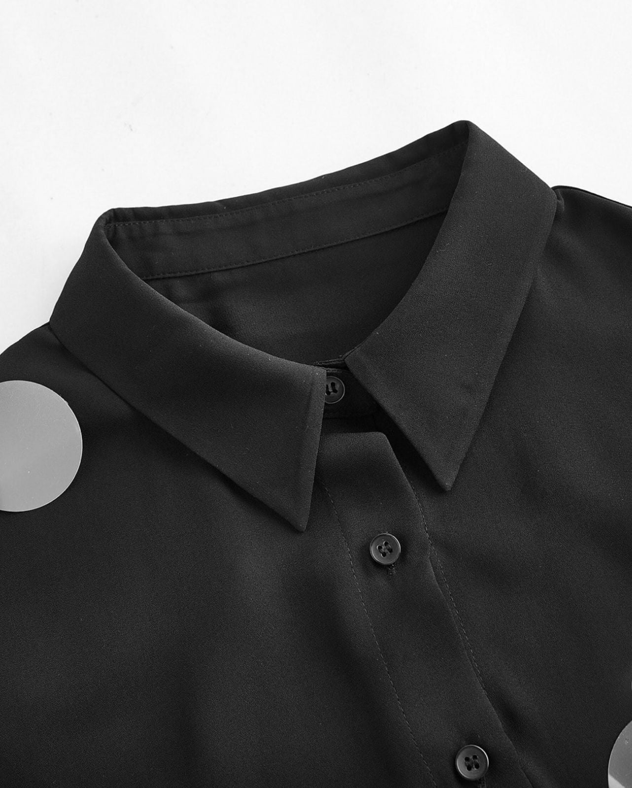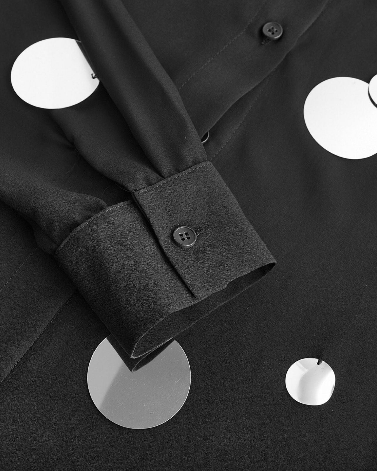 Set camisa y minifalda en color negro que combina un corte clásico con una decoración statement y festiva. La camisa es de silueta holgada, con mangas largas abotonadas y cuello camisero, y está adornada con lentejuelas grandes y circulares de acabado plateado/espejo dispersas de forma asimétrica, incluyendo algunas que son colgantes y en capas. La minifalda a juego complementa el look con una base lisa y un borde inferior totalmente cubierto y decorado con una cascada densa de lentejuelas circulares de gran tamaño y distintos tonos de plata, creando un efecto brillante y dinámico ideal para eventos nocturnos o looks de alto impacto.