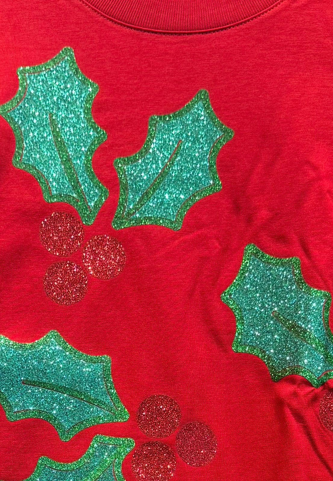 T-shirt Navideña con figuras de hojas verdes y esferas rojas brillantes, inspiradas en decoraciones navideñas.