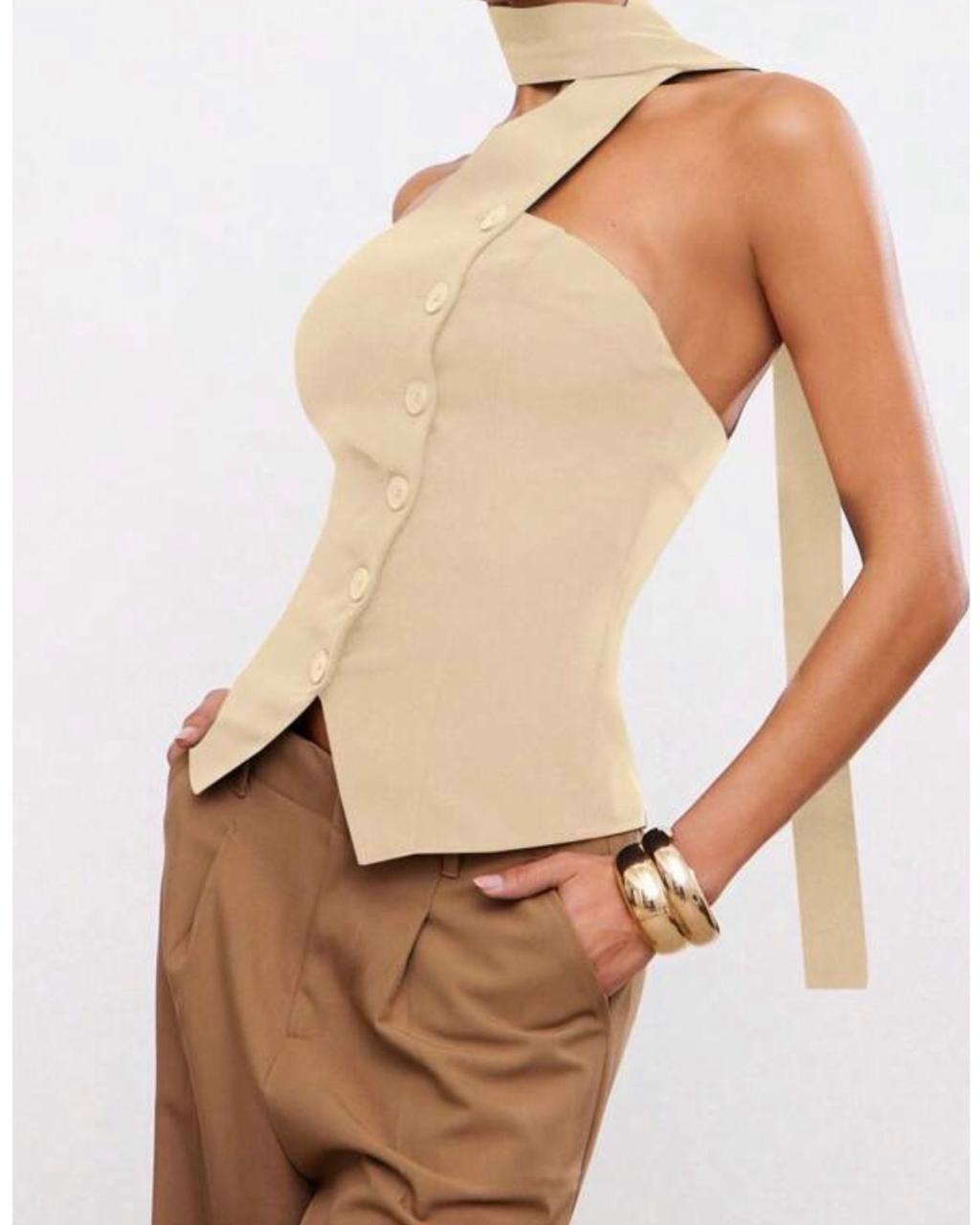 Top asimétrico tipo halter confeccionado en un tejido de acabado suave y elegante. Presenta un diseño de un solo hombro con cuello alargado que se anuda alrededor del cuello, creando un efecto moderno y sofisticado. Su silueta estructurada realza la figura, mientras que los botones decorativos al frente añaden un toque distintivo y vanguardista. Ideal para looks de noche o para elevar un conjunto de sastrería con un aire contemporáneo y refinado.