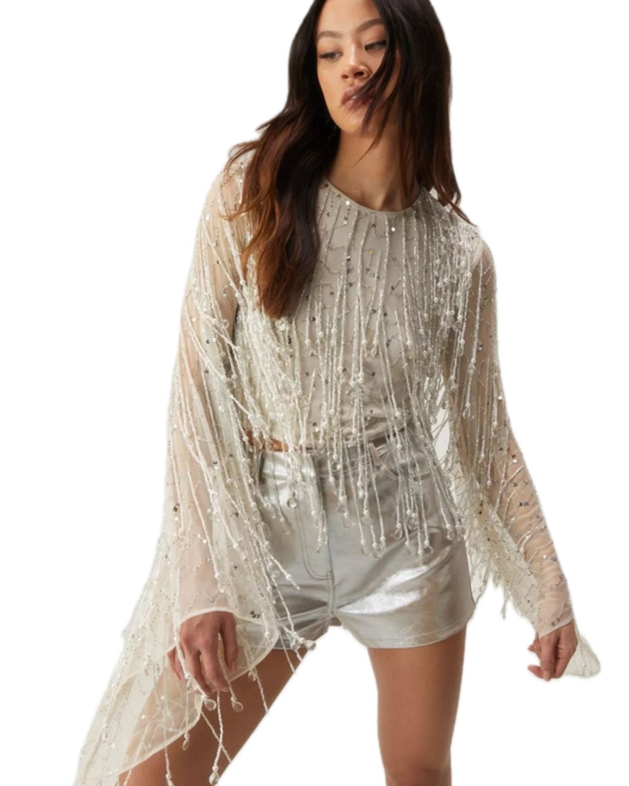 Top semitransparente confeccionado en malla con aplicación de cuentas y lentejuelas que crean un efecto de movimiento y brillo. Diseño de cuello redondo y manga larga, adornado con flecos de pedrería que aportan dinamismo y elegancia a cada paso. Una pieza de impacto ideal para looks de noche o eventos especiales, combinando glamour y sofisticación contemporánea.