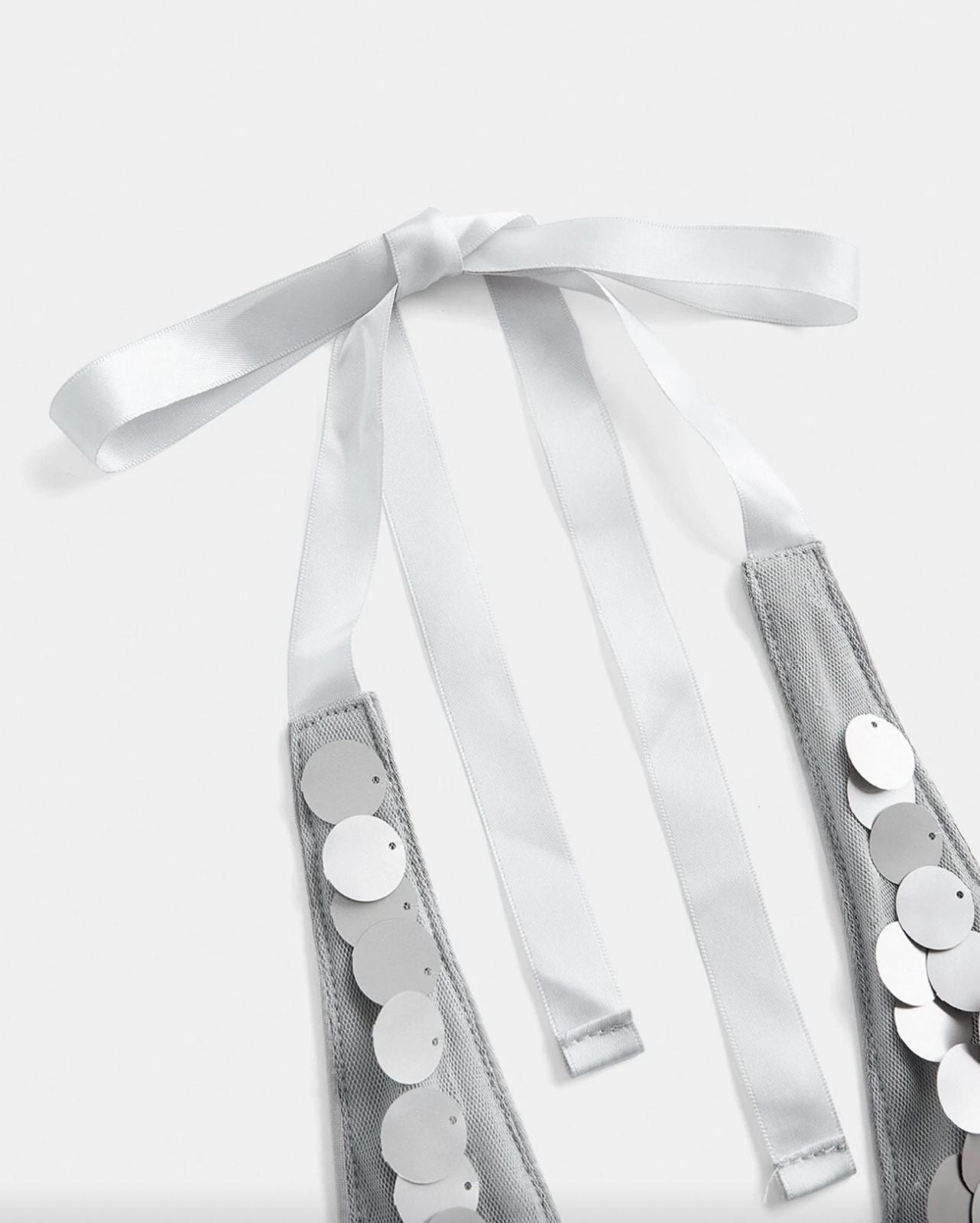 Top de estilo corsé o bustier con un diseño enérgico y brillante en el busto, que mezcla la tendencia rave o de festival con la estructura clásica del corsé. Top halter corto con una silueta ajustada y estructurada, inspirada en un corsé o bustier. tono gris claro o plateado suave, Las lentejuelas cubren completamente el área del busto en forma de copas de bikini o triángulo, creando un impacto visual fuerte y reflectante. La espalda presenta un cierre de corsé con cordones (lazada). Una cinta del mismo color que la base (gris/plateado) se entrelaza a través de ojales, lo que permite ajustar el top a la figura y le añade un detalle romántico y vintage.