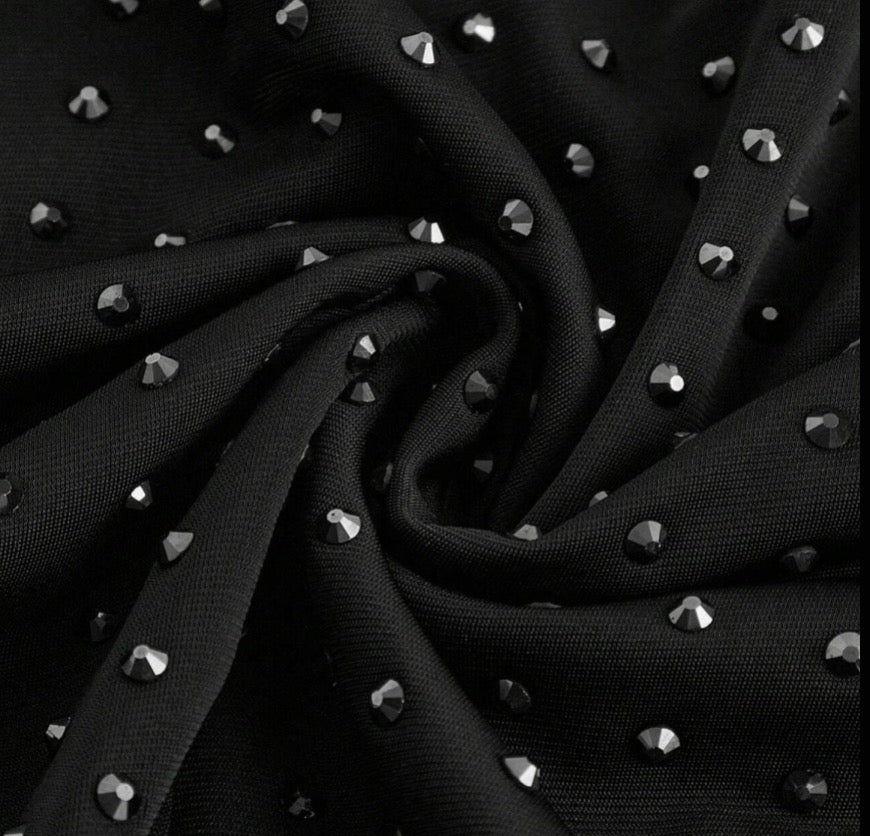 Los apliques de rhinestones están dispuestos de forma ordenada en todo el cuerpo del vestido, aportando textura y reflejos sutiles que capturan la luz con cada movimiento. El cuello alto añade un aire de elegancia clásica, ideal para eventos nocturnos, cócteles o celebraciones con un código de vestimenta chic.