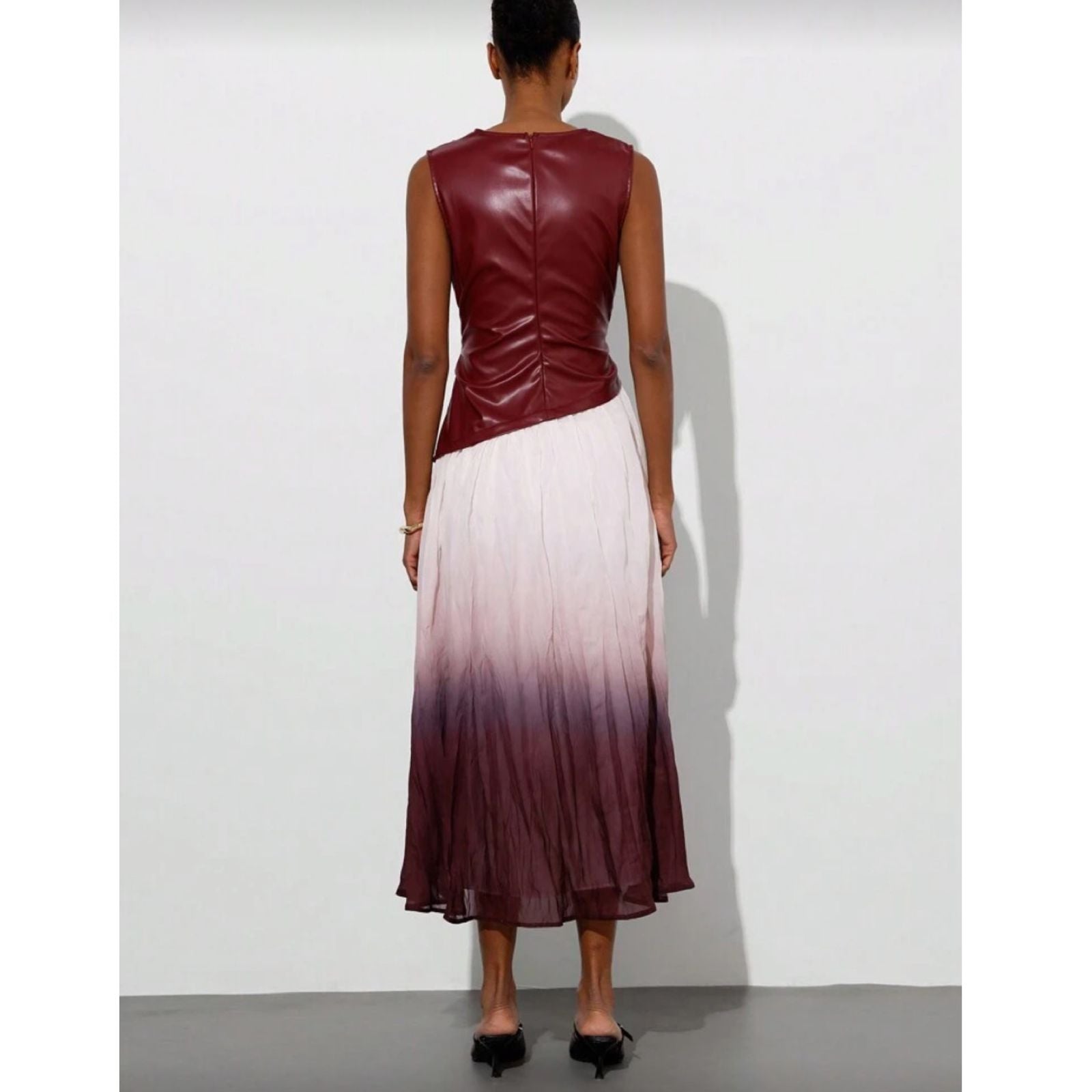 Este vestido combina texturas y tonos de manera sofisticada. Presenta un diseño tipo 2 en 1, con un top sin mangas en imitación de cuero color vino que se ajusta al cuerpo y resalta la silueta. La parte inferior contrasta con una falda midi de caída ligera, confeccionada en tejido fluido con efecto degradé en tonos marfil y burdeos, aportando movimiento y elegancia. Su corte asimétrico en la unión del top y la falda añade un toque moderno y estructurado.