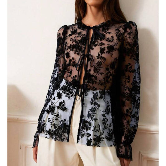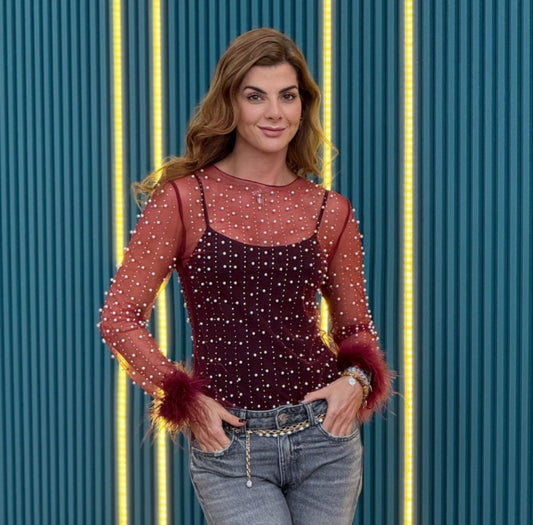 Top Malla con Apliques de Perlas y Plumas en las Mangas