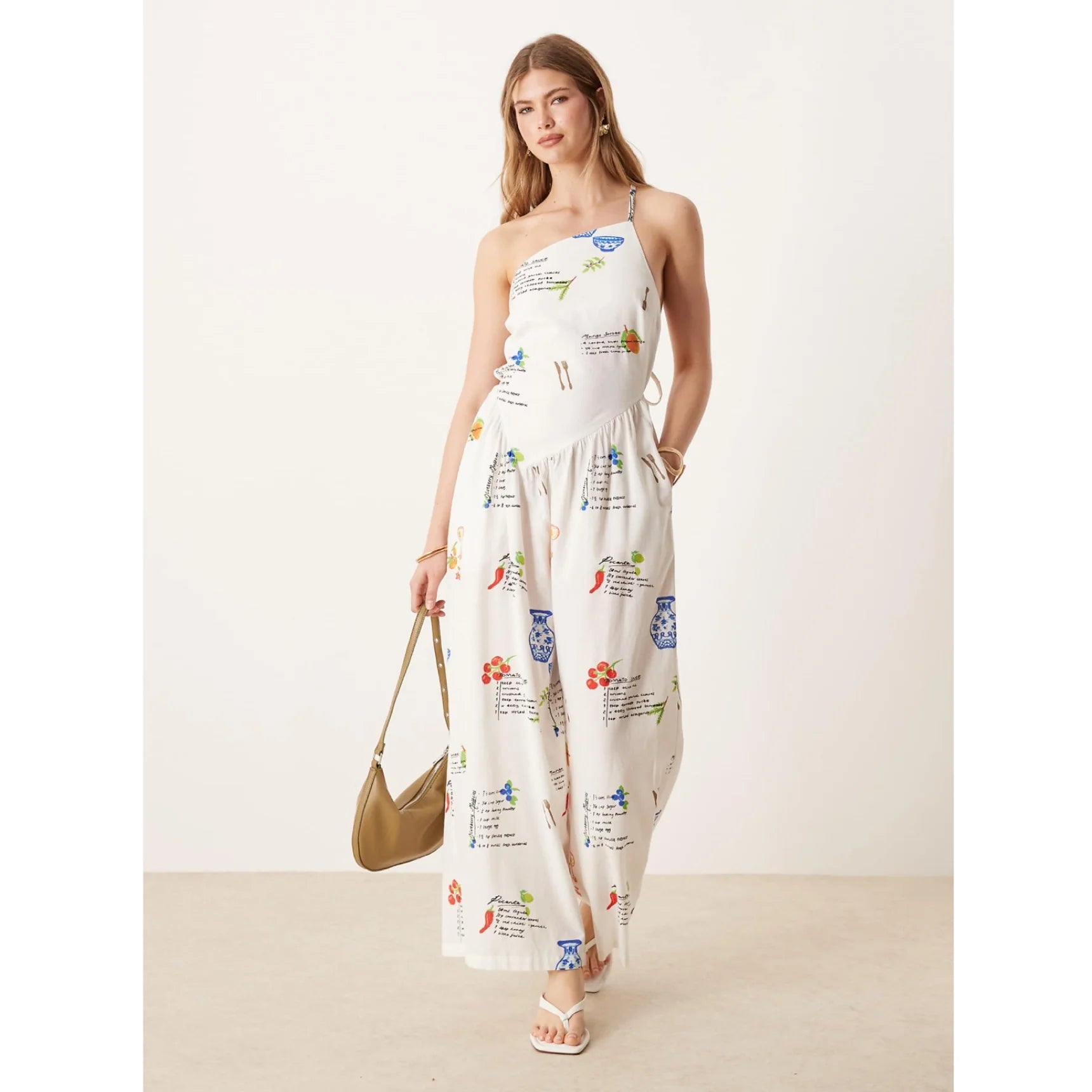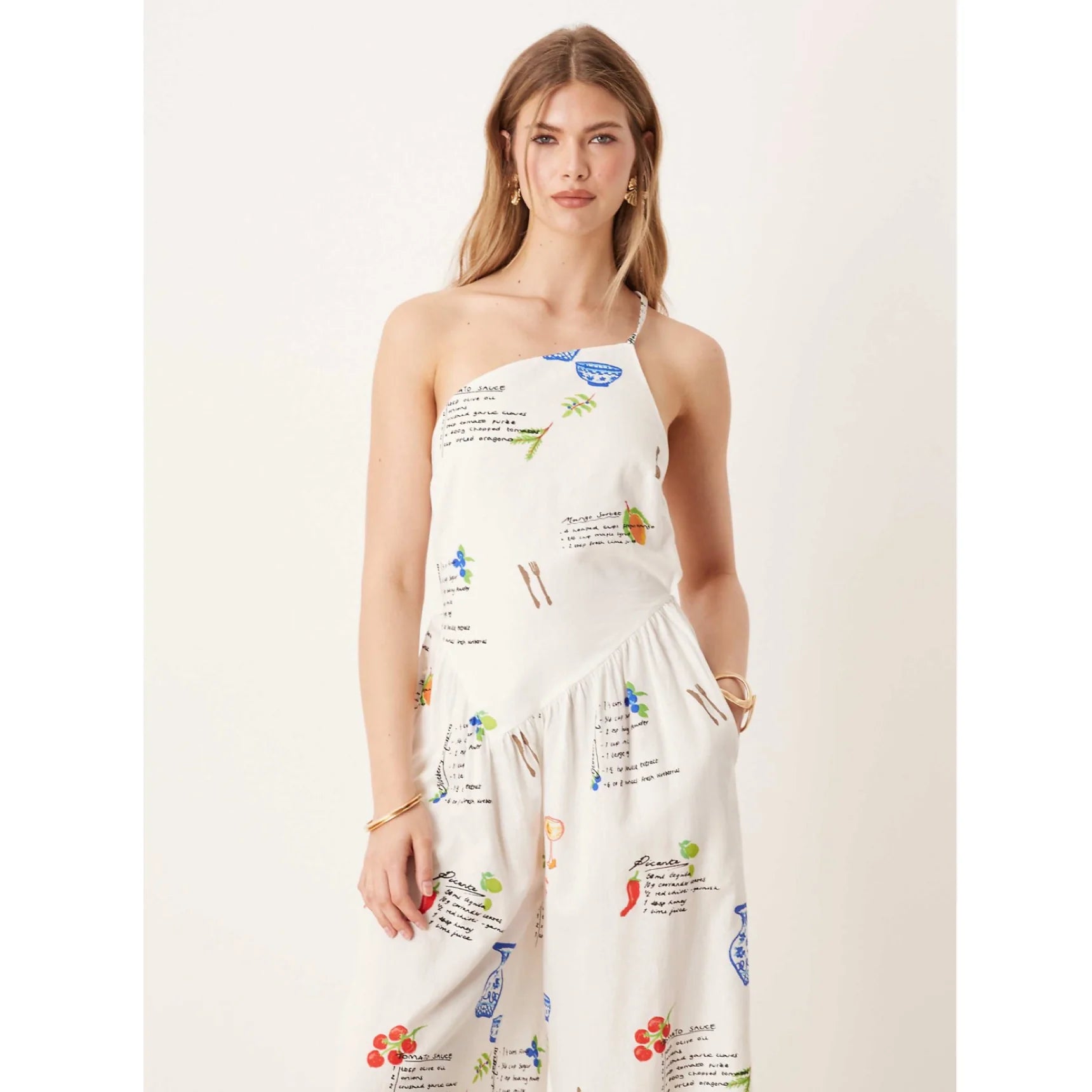 Presenta un diseño asimétrico con un solo tirante delgado y una caída fluida desde la cintura, que le da movimiento y comodidad. La cintura ligeramente fruncida realza la silueta sin ajustarla demasiado, y los pantalones anchos aportan un toque relajado y elegante.