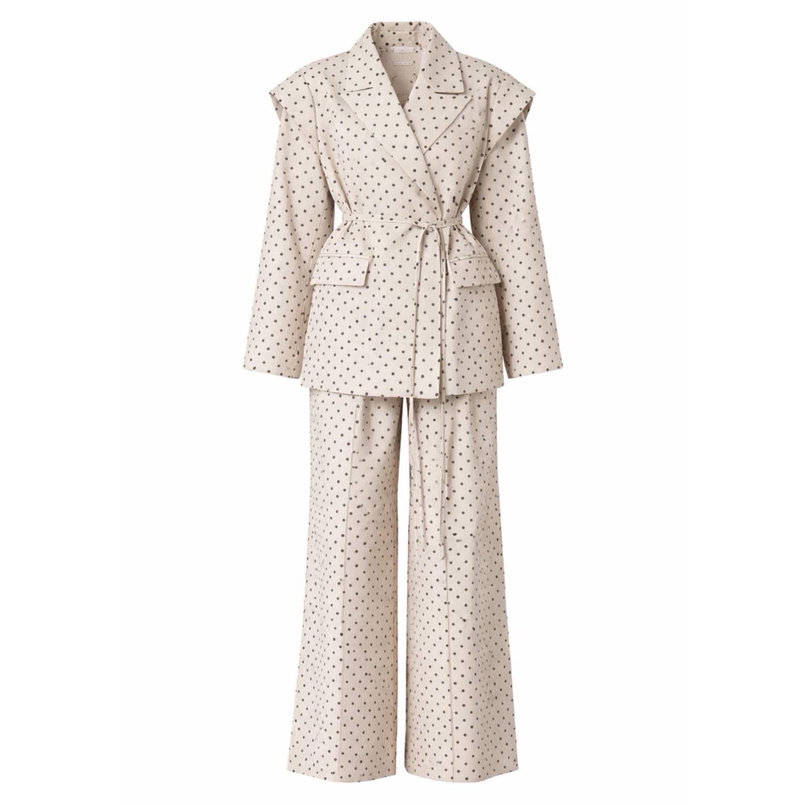 El set blazer y pantalon de dos piezas destaca por su sofisticado estampado de lunares en una paleta de tonos neutros, fusionando el estilo clásico con detalles de vanguardia. El blazer presenta un diseño estructurado con solapas de muesca, bolsillos laterales con tapeta y un distintivo detalle de hombros caídos con volantes rígidos que aportan volumen y modernidad; además, incluye un cinturón delgado anudable que define la silueta. Por su parte, el pantalón de corte recto y pernera amplia complementa el look con una caída fluida y elegante, ideal para un estilismo contemporáneo que equilibra la sastrería tradicional con toques femeninos y estructurados.