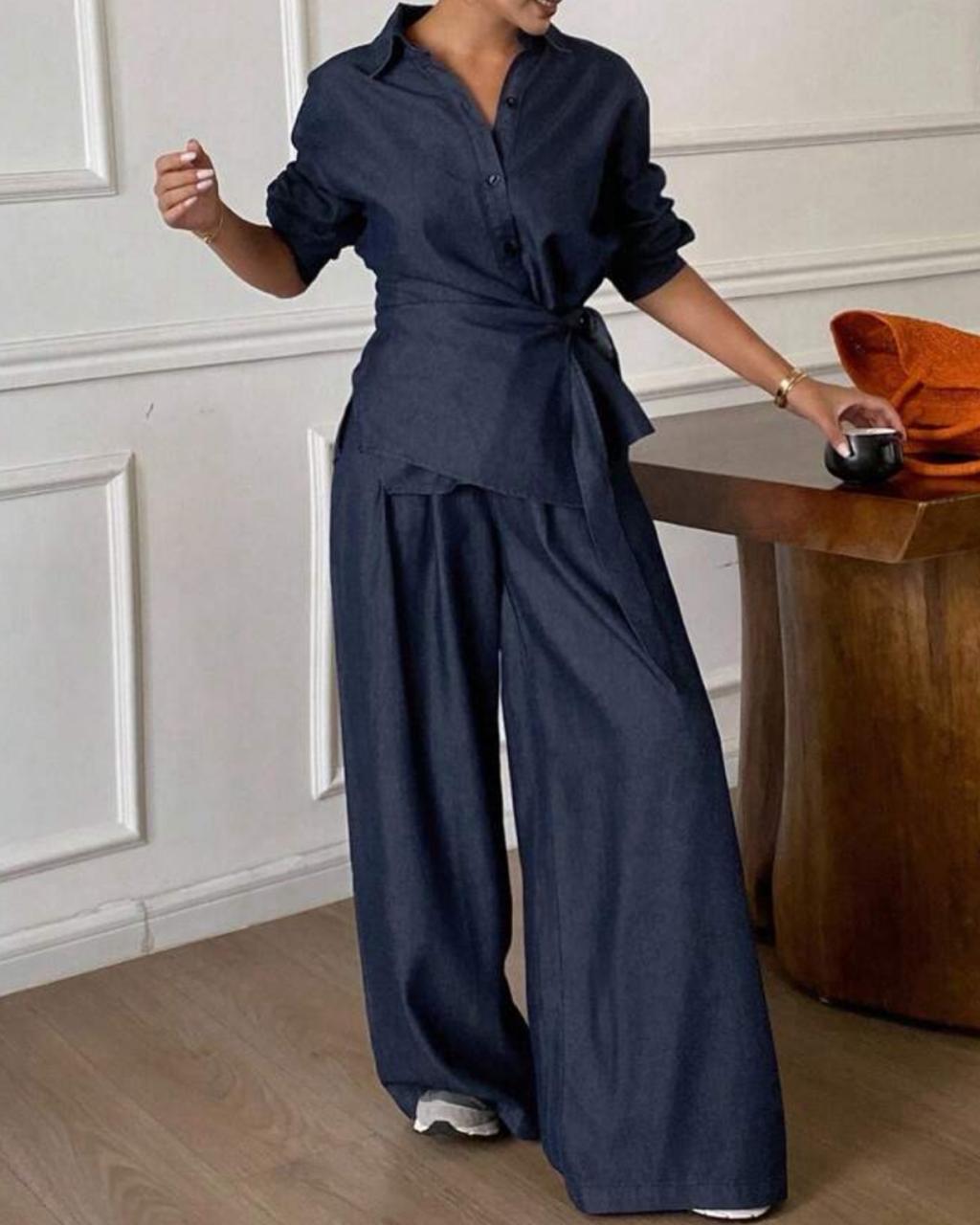El Set de Camisa y Jean Denim proyecta un estilo moderno y sofisticado, caracterizado por una estética monocromática y relajada. La camisa y el pantalón, ambos en un tono denim azul oscuro y de tejido fluido, crean una silueta armoniosa y cómoda. La camisa presenta un cuello clásico y se distingue por un original cinturón o faja anudada a la cintura, que define la figura y añade un toque chic y estructurado, superponiéndose ligeramente al pantalón. Los jeans son de corte palazzo o muy ancho, aportando movimiento y una caída elegante que alarga visualmente la figura, resultando en un look versátil que transita entre lo casual y lo elevado.