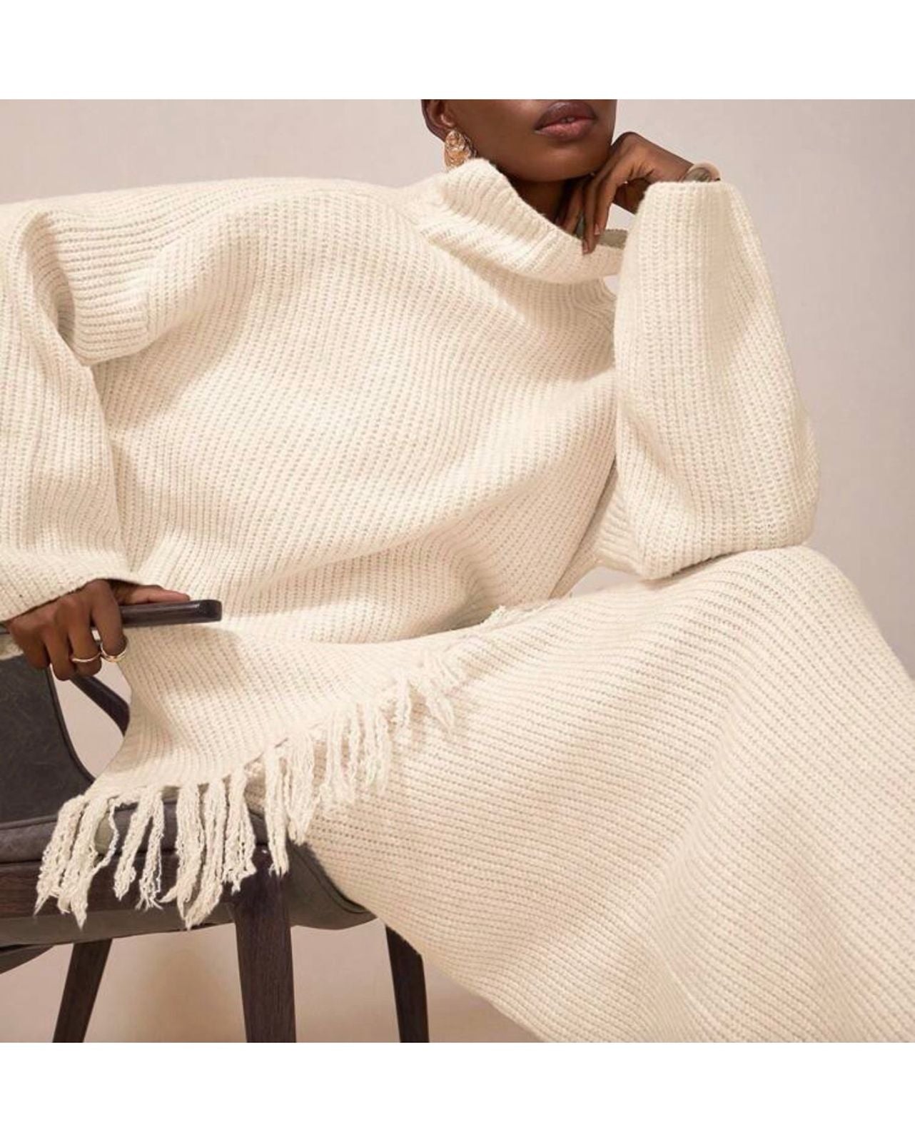 El set sweater y falda de corte midi, ambos de punto trenzado o acanalado grueso en un sofisticado color blanco crudo o crema. El sweater presenta un cuello de tortuga alto y mangas largas y amplias. La parte inferior del suéter se caracteriza por un dobladillo con flecos que añade textura y un elemento de estilo boho-chic. La falda, de corte recto y ajustado, también presenta un dobladillo con flecos en el borde inferior. Este set monocromático irradia comodidad y elegancia invernal, creando una silueta alargada y texturizada que es ideal para climas fríos.