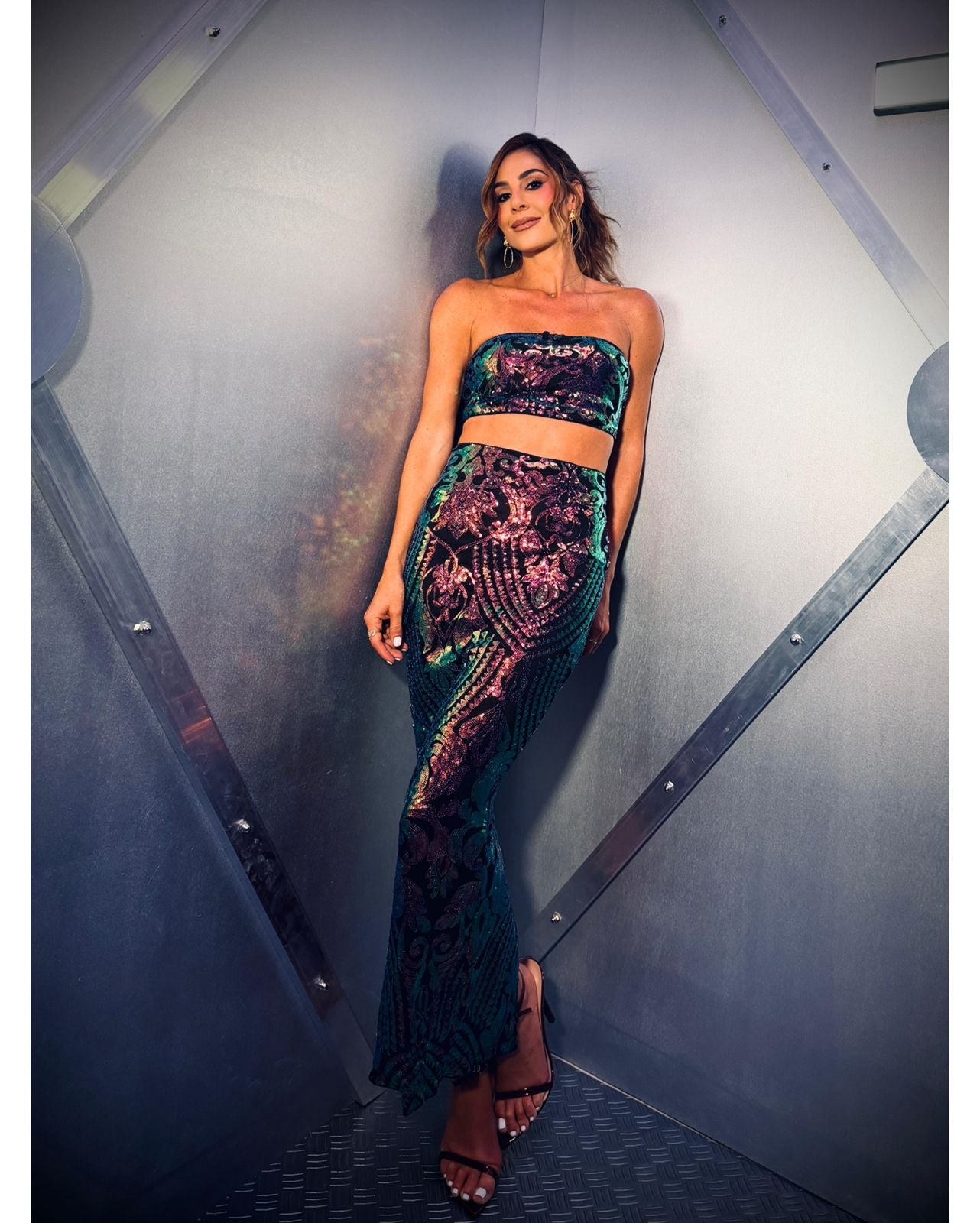 Set de dos piezas confeccionado en tela de lentejuelas multicolor con efecto iridiscente que refleja tonos verdes, púrpuras y dorados. El top tipo bandeau presenta un diseño ajustado con amarre cruzado en la espalda, que aporta un toque sensual y moderno.