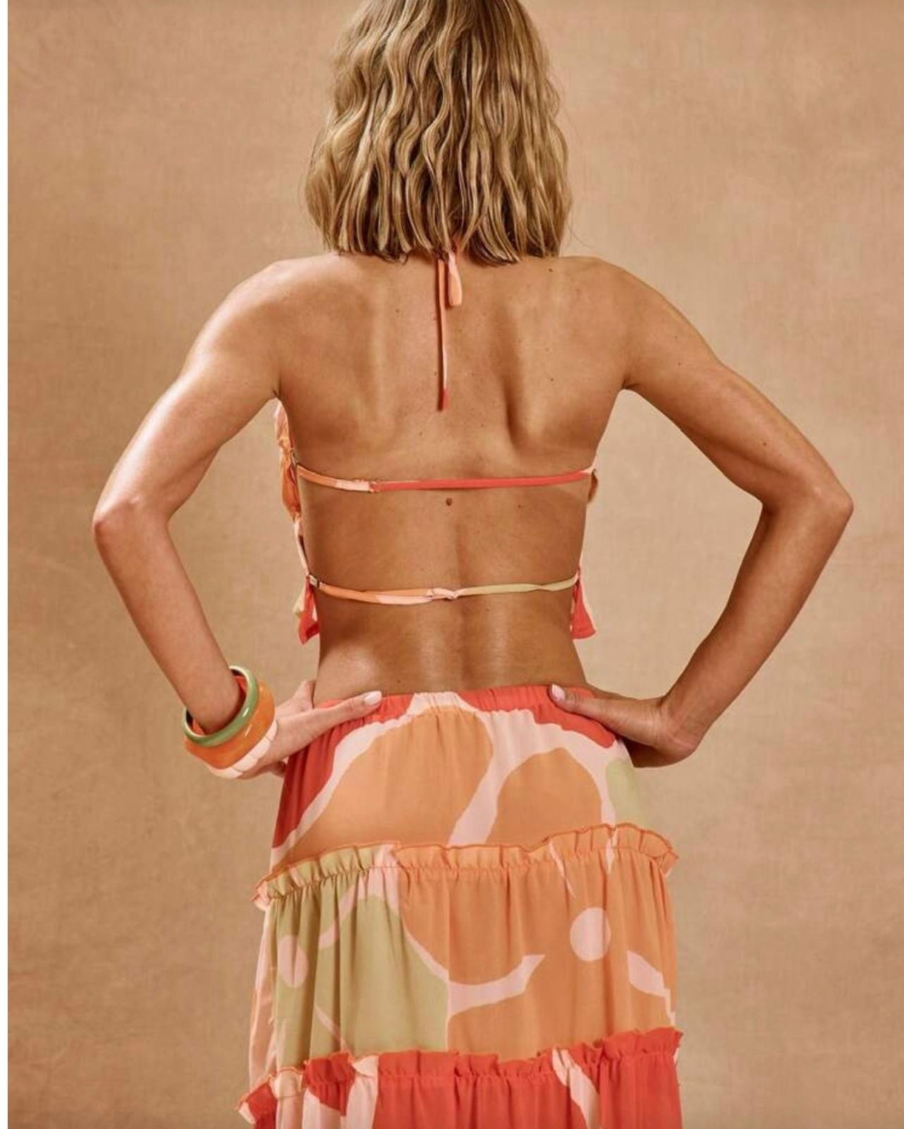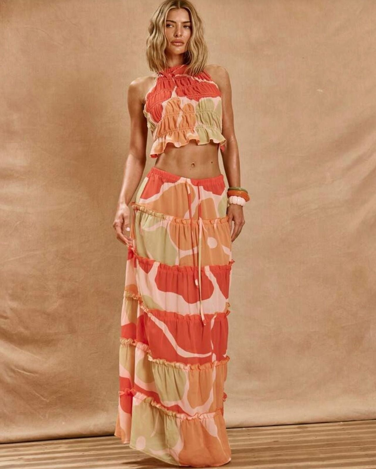 Este es un vibrante y veraniego set de dos piezas compuesto por un crop top y una maxi falda, ambos confeccionados en una tela ligera y fluida con un llamativo estampado abstracto o floral grande en tonos cálidos como naranja coral, rosa pálido, y verde oliva/caqui. El top es de estilo halter con cuello alto y presenta un cuerpo fruncido (smocked o elástico) que termina en un volante corto a la altura de la cintura, dejando el abdomen al descubierto. La maxi falda es de corte amplio y largo hasta el suelo, estructurada en varios niveles de volantes (tiered) con un cordón ajustable en la cintura, creando un look bohemio y festivo ideal para climas cálidos o vacaciones.