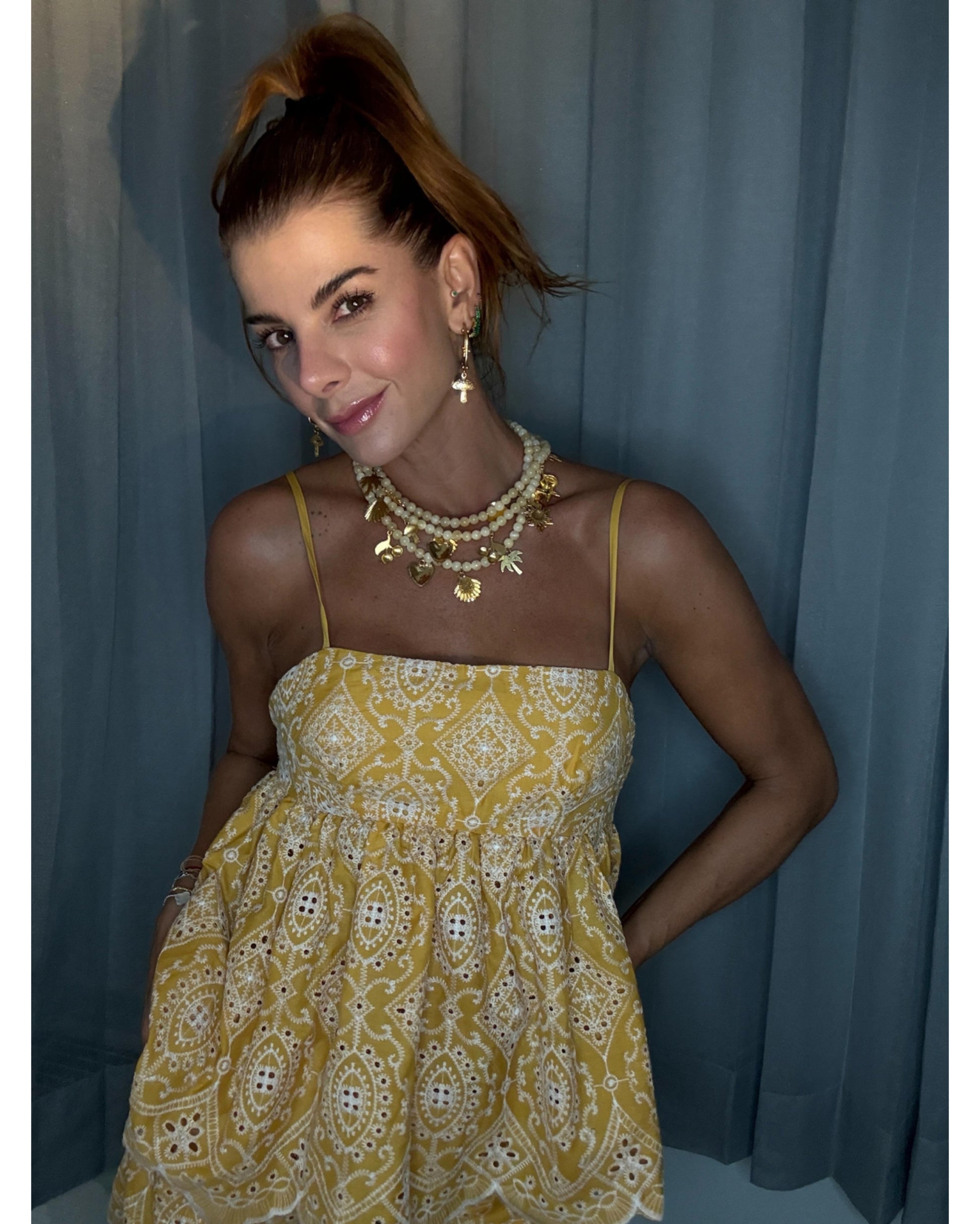 El top presenta tirantes delgados y escote recto, con un diseño suelto de doble capa y terminaciones onduladas que aportan movimiento y un aire romántico. El short a juego mantiene la misma tela calada, con ruedo festoneado que resalta el detalle artesanal del ojalillo.