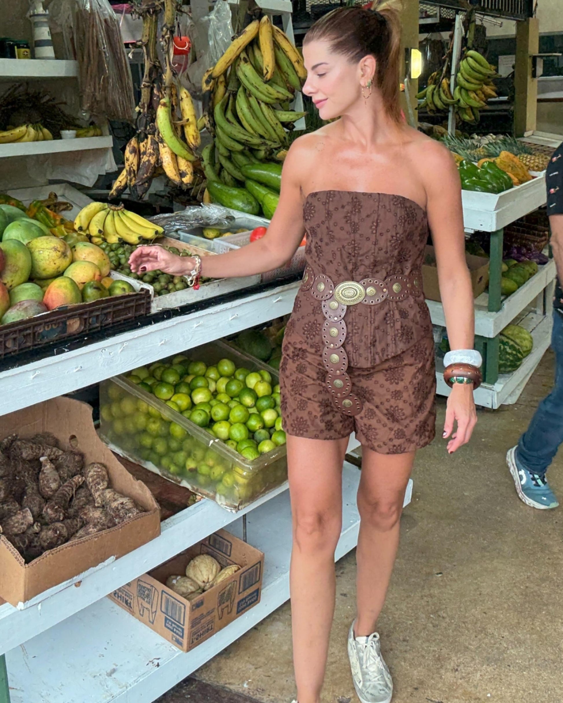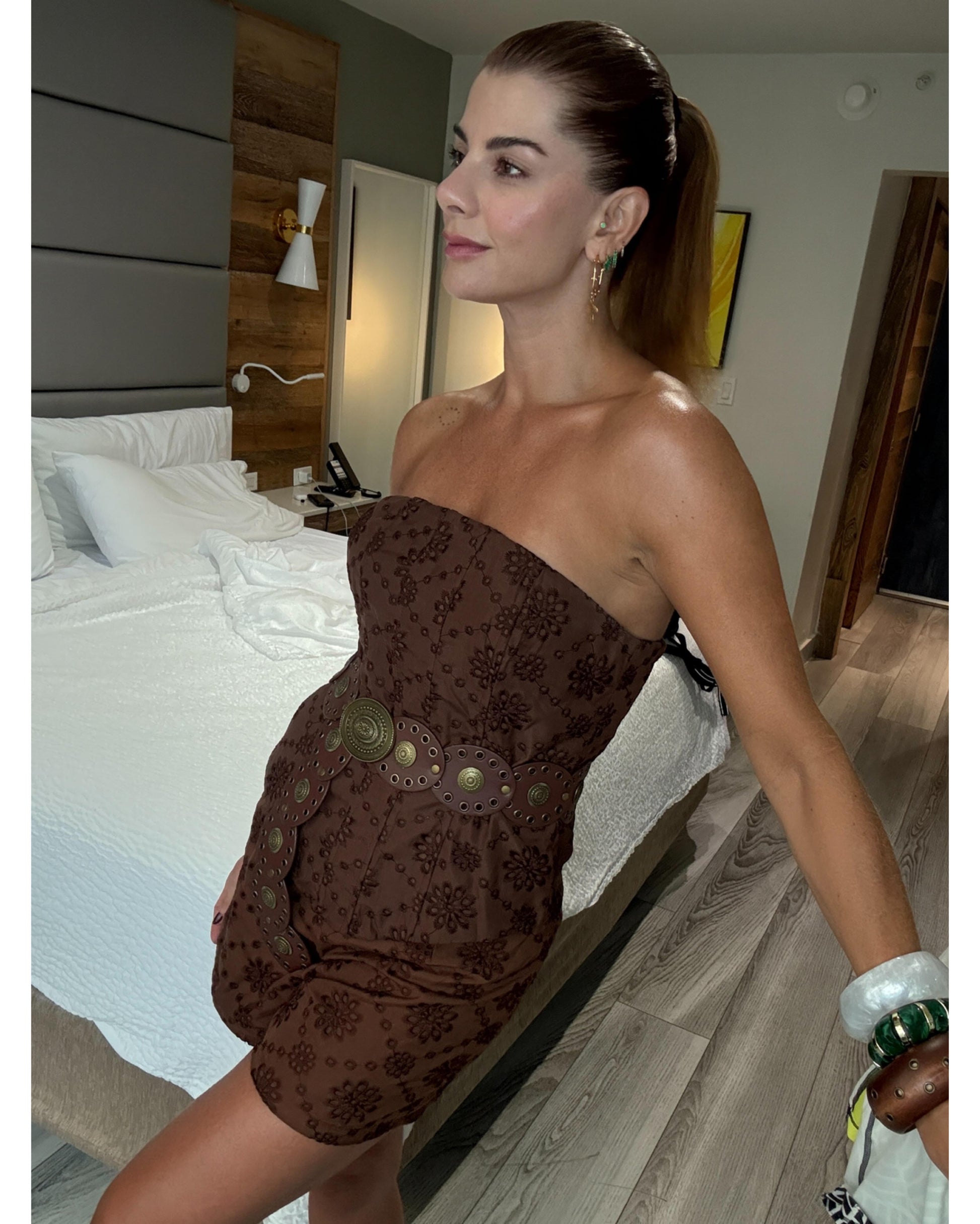 El set strapless en ojalillo está elaborado en tela de algodón tipo ojalillo en tono marrón, con delicado bordado floral que aporta un aire femenino y bohemio.