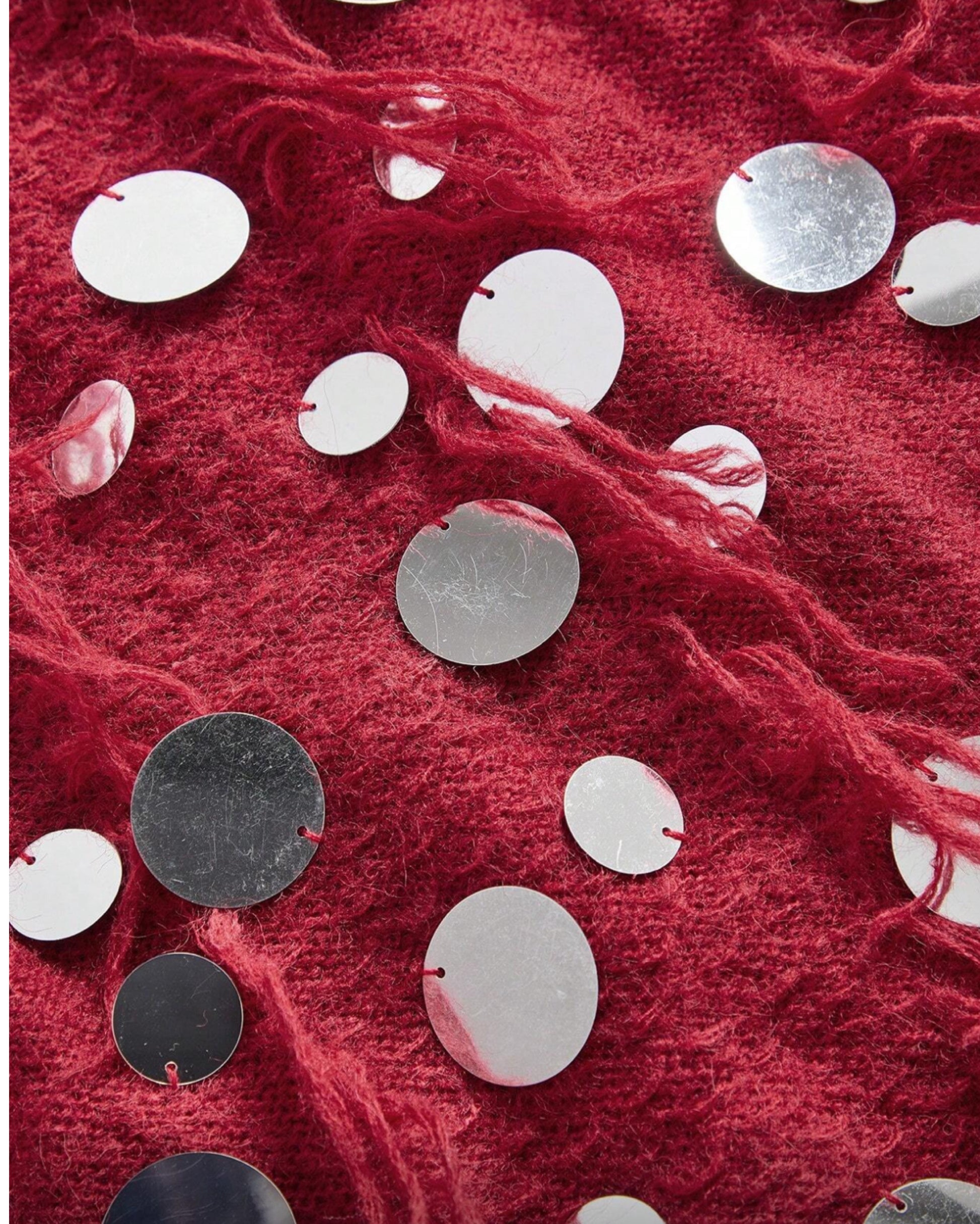 El sweater rojo con lentejuelas es la combinación perfecta de elegancia y un toque atrevido. Su diseño con aplicaciones de lentejuelas plateadas grandes le da un efecto deslumbrante, ideal para destacar en cualquier ocasión especial o elevar un look casual con un giro glamuroso. Su tejido ligero y de acabado deshilachado añade un aire moderno y desenfadado.