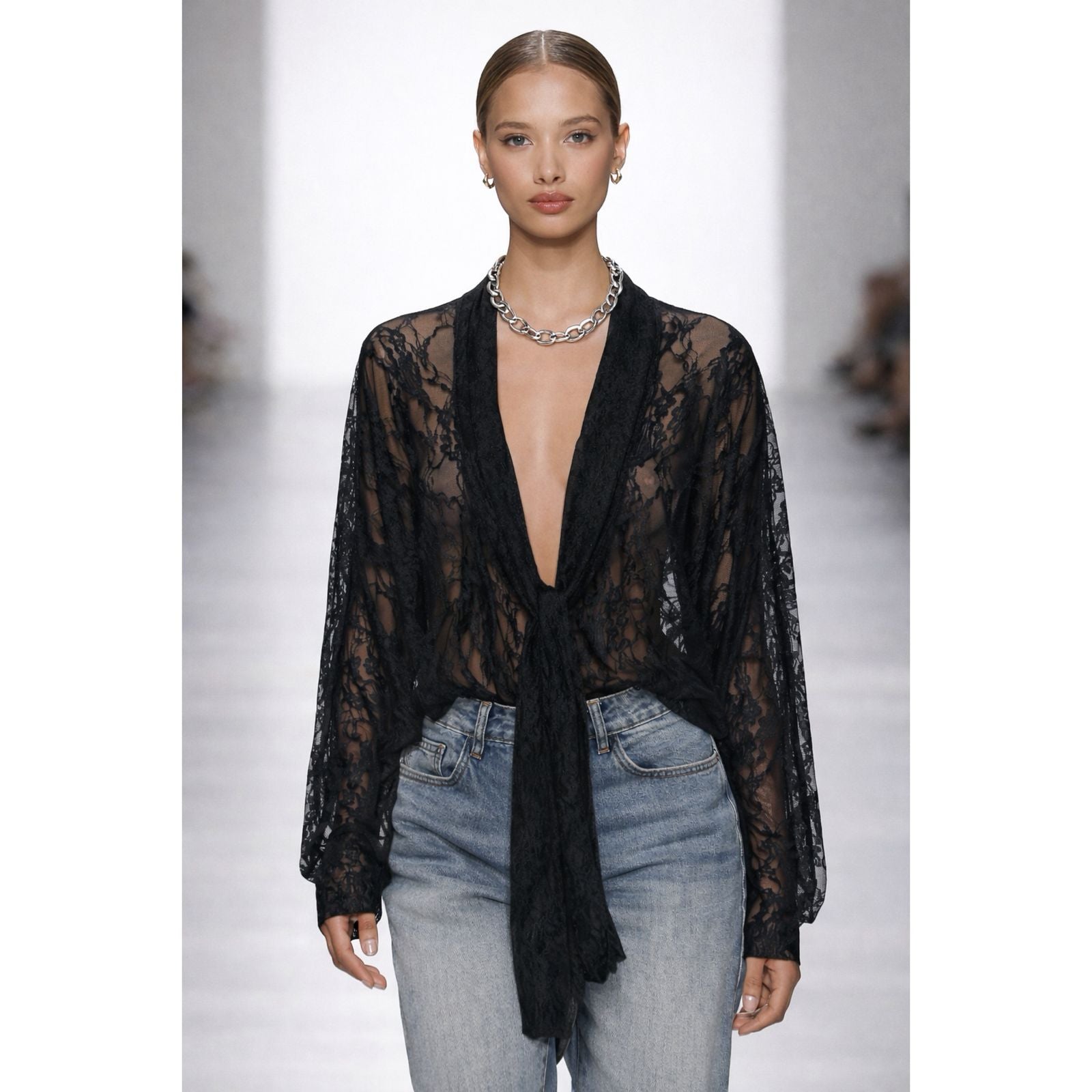 El top de encaje negro se destaca por su diseño audaz y femenino, caracterizado por un pronunciado escote en "V" profundoque se extiende de manera fluida hacia el torso. Confeccionado en un tejido transparente con delicados motivos florales, la prenda presenta mangas largas y holgadas que aportan un aire etéreo y romántico al conjunto. El detalle central de la caída de la tela crea un efecto de amarre frontal que añade movimiento, convirtiéndolo en una pieza de declaración ideal para combinar con básicos como denim para un contraste moderno o con prendas formales para un look de noche impactante.