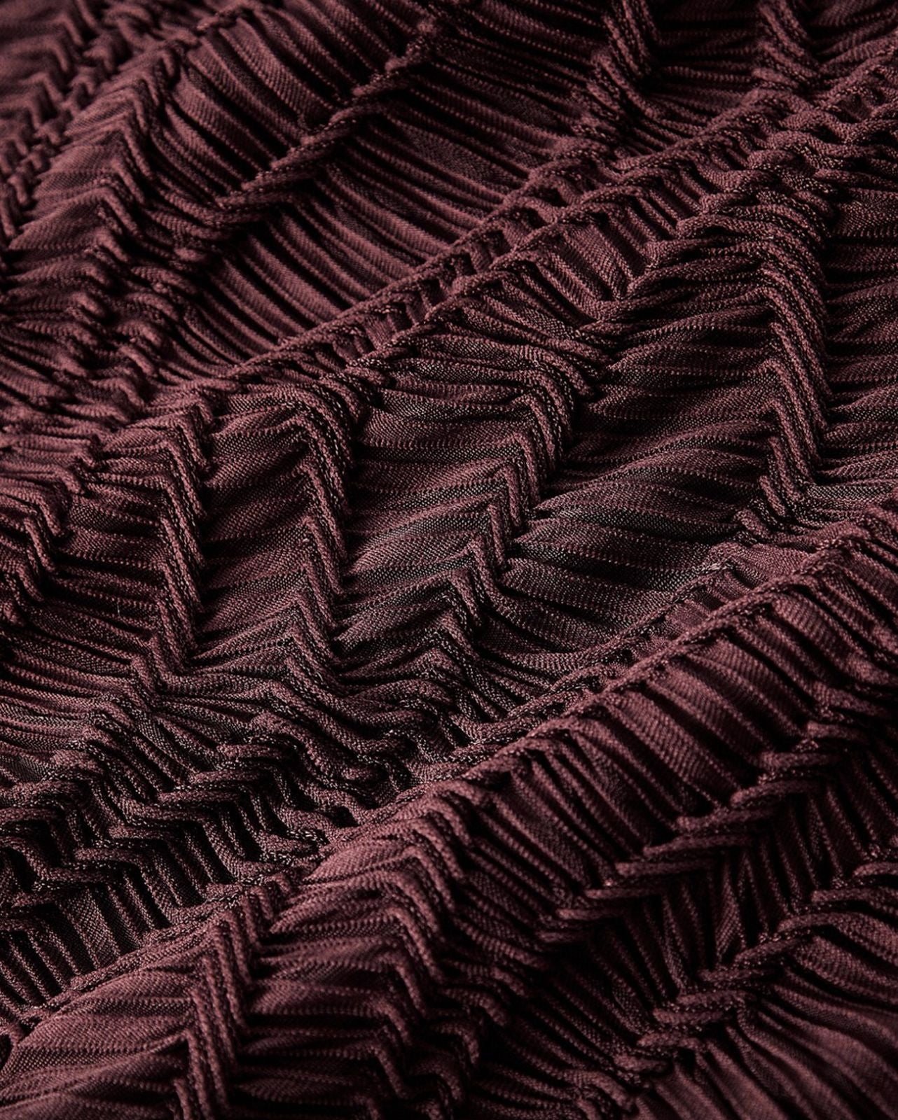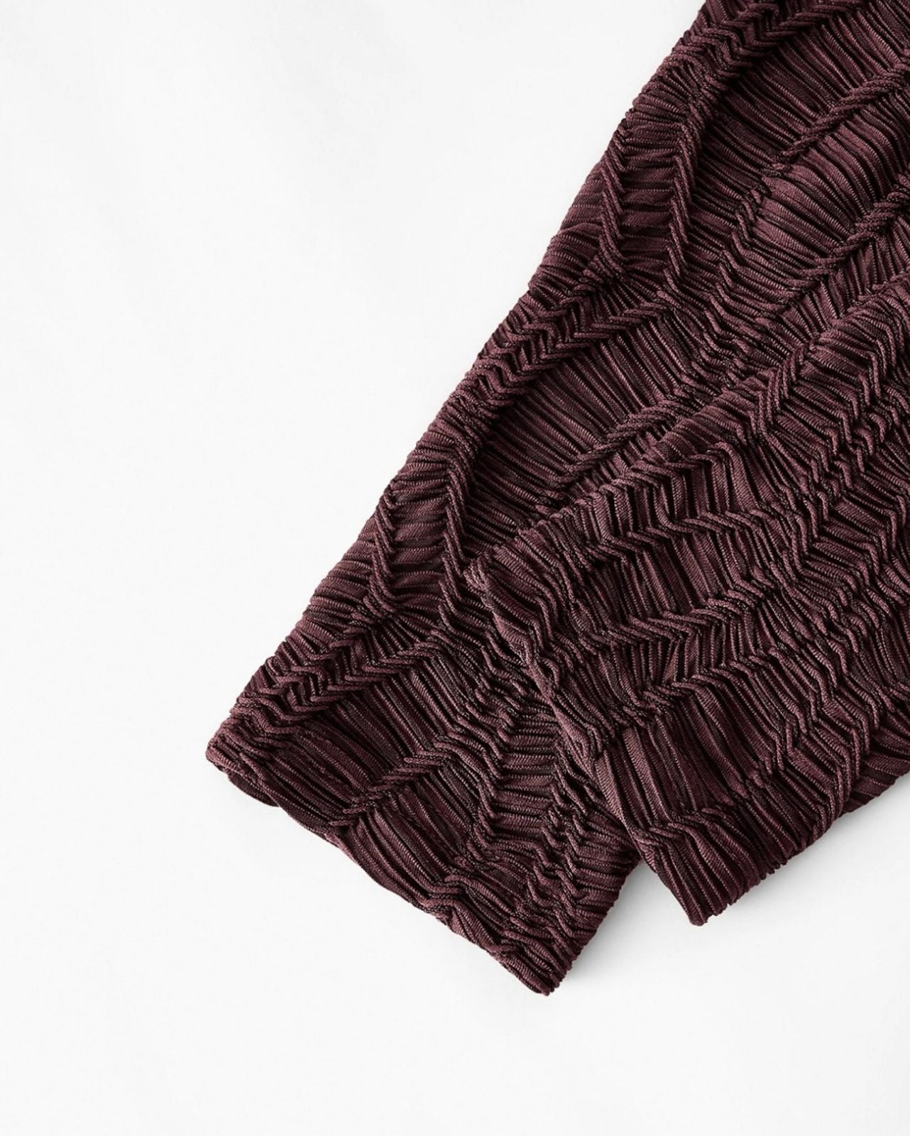 Esta sección presenta una textura muy detallada y elaborada, probablemente lograda con una técnica de smocking o fruncido elástico que crea un patrón tridimensional. El patrón es geométrico y ondulado, con líneas en zigzag o chevrón, dándole un aspecto visual de rica complejidad y relieve.