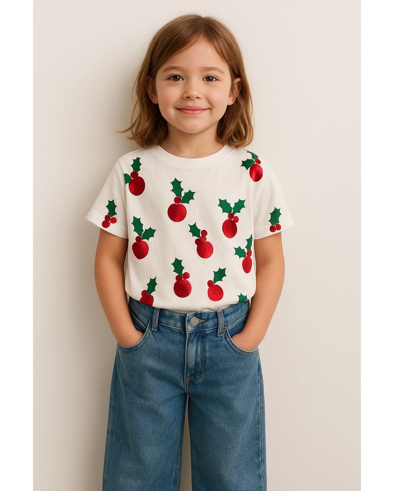T-shirt Navideña con apliques de lentejuela en relieve con figuras de hojas verdes y esferas rojas brillantes, inspiradas en decoraciones navideñas.